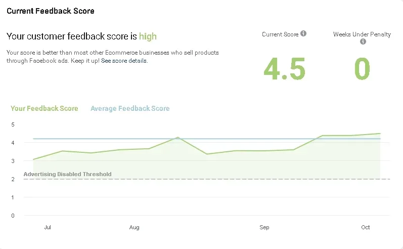 Nossa pontuação oficial de avaliação do cliente no Facebook atingiu 4,5 em 5. As páginas com avaliação do cliente abaixo de 2 não poderão mais anunciar. Levamos muito a sério a qualidade de nossos produtos e atendimento ao cliente. Tenha a certeza de comprar os produtos